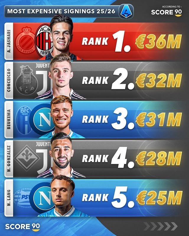 1、亚沙里,布鲁日斯→米兰,3600万欧